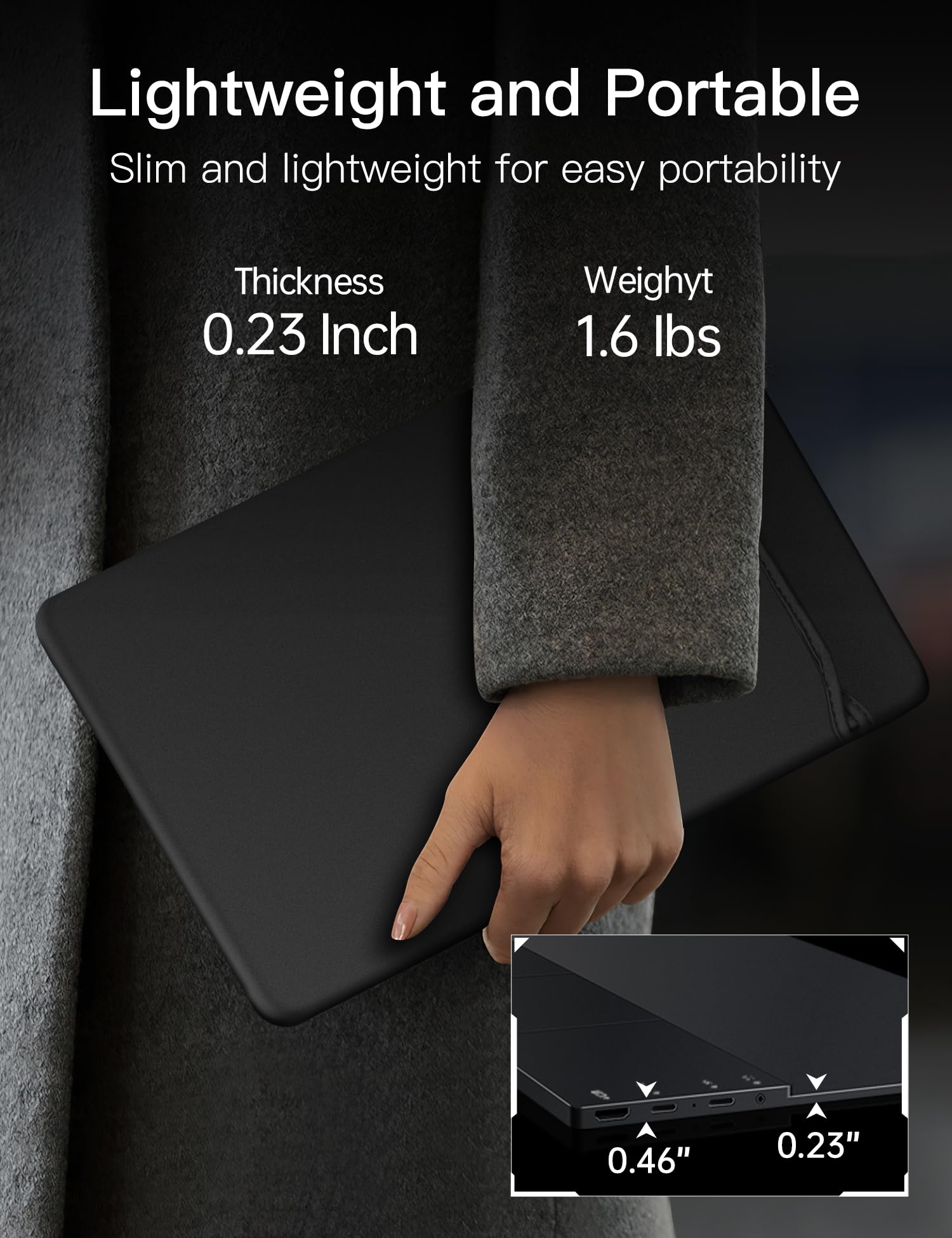 - Lightweight Portable Travel Monitor: Ultra-slim and easy to carry, this monitor fits conveniently into a suitcase or backpack. With an aluminum body and an ultra-slim bezel, it weighs only 1.6 pounds, enhancing portability. A protective sleeve is also included for added security.